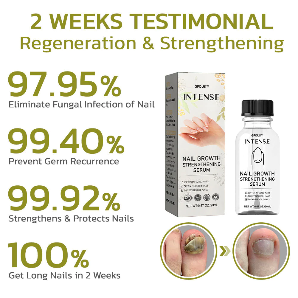 Discover the transformative potential of GFOUK™️ Intense Nail Growth and Strengthening Serum. Crafted to bolster nail health and strength, this innovative product specifically targets and eliminates nail fungus. Ideal for individuals with weak or brittle nails, it provides essential nutrients to naturally enhance nail growth. With regular use, within just 2 weeks, you’ll observe accelerated nail growth and improved strength, revealing visibly healthier nails.