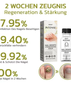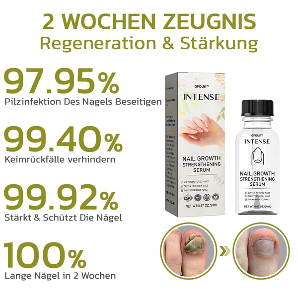 Entdecken Sie das transformative Potenzial von GFOUK™️ Intensives Serum für Nagelwachstum und stärkung. Dieses innovative Produkt wurde entwickelt, um die Gesundheit und Festigkeit der Nägel zu stärken, und bekämpft gezielt Nagelpilz. Es ist ideal für Menschen mit schwachen oder brüchigen Nägeln und liefert wichtige Nährstoffe, um das Nagelwachstum auf natürliche Weise zu fördern. Bei regelmäßiger Anwendung werden Sie innerhalb von nur 2 Wochen ein beschleunigtes Nagelwachstum und eine verbesserte Festigkeit beobachten können, was zu sichtbar gesünderen Nägeln führt.