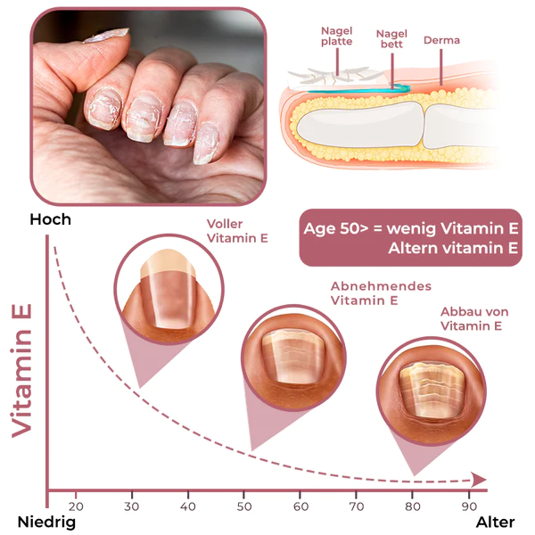 Eine bessere Durchblutung ist für ein gesundes Nagelwachstum absolut notwendig, und die Macht der Vitamin E kommt ins Spiel durch deutliche Verbesserung der Durchblutung des Nagelbetts. Dieser wichtige Prozess sorgt dafür, dass alle notwendigen Nährstoffe effizient zu den Nägeln gelangen, die als Bausteine für ein robustes und widerstandsfähiges Wachstum dienen. Mit dieser verbesserten Zirkulation, Ihre Nägel werden mit den notwendigen Nährstoffen versorgt, die ihr Wachstum und ihre Festigkeit fördern, Lösung für die frustrierende, altersbedingte Nagelablösung, da Ihre Nägel eine neue Vitalität erlangen.