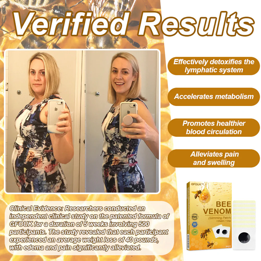 The digestive and lymphatic systems are crucial detox pathways in the body. That’s why we developed the GFOUK™ Bee-venom slimming patch, containing bee venom and extracts of iceplant, along with four herbal extracts. These highly active ingredients are concentrated and encapsulated within the film of the slimming patch. During application, the close contact between the abdominal area and the silk film made of natural herbs stimulates intestinal peristalsis, allowing for faster and more effective penetration into the lymphatic system. By cleansing the lymph nodes to rid waste, aiding liver detoxification, and absorbing toxins, it improves metabolism, facilitating effortless fat loss, reducing inflammation, and promoting overall bodily health.