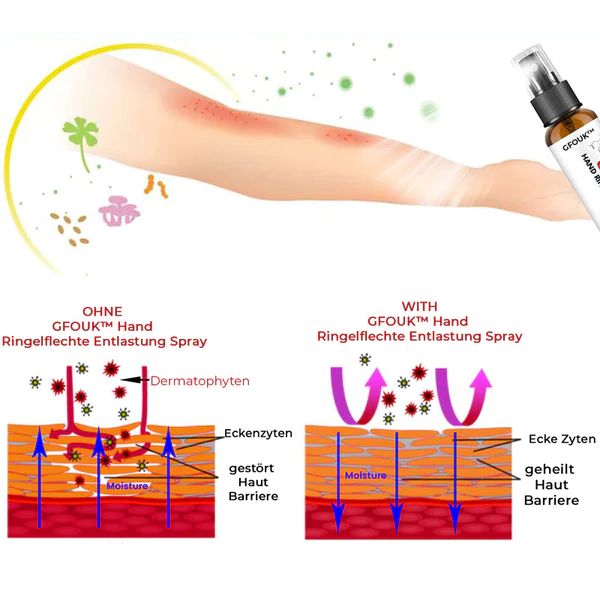 The itching, burning, cracking, and scaling brought on by fungal infections are reduced by GFOUK™ Hand Ringworm Relief Sprays, which also eliminate the fungi that are causing them. Ringworm Treatment Sprays might lessen the chance of secondary infections that can aggravate inflammation by promoting healing of the affected skin. Ringworm Treatment Sprays can assist to enhance the general health and look of the skin by removing the fungus and enabling the skin to regenerate.