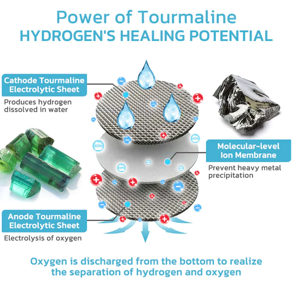 ✓ Fortschrittliche Technologie: Der Untersetzer verfügt über eine hochmoderne Technologie, die Turmalin-Energiesteine nutzt, um Wassermoleküle zu optimieren, was zur Produktion von Wasserstoff und Sauerstoff für eine verbesserte Aufnahme und gesundheitliche Vorteile führt.