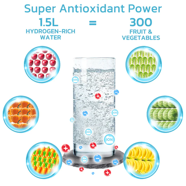 • Starke antioxidative Wirkung: 1,5 Liter wasserstoffreiches Wasser pro Tag – dies entspricht dem antioxidativen Wert von mehreren hundert Früchten und Gemüsen.