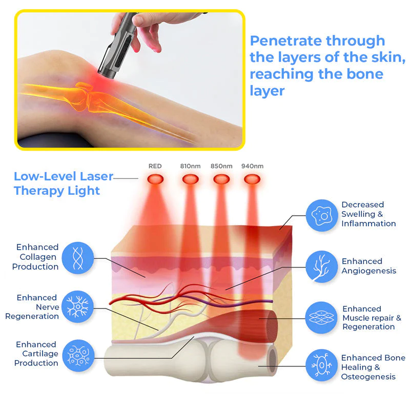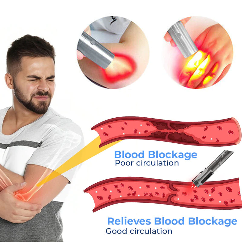 The GFOUK™ MedicWave Thermal Laser Joint Care Pen starts cellular repair processes, which include helping DNA repair and starting up different cellular communication pathways. Thermal laser light may improve blood circulation in the treated area. Improved blood flow can enhance the delivery of oxygen and nutrients to cells, promoting tissue repair and reducing stiffness.