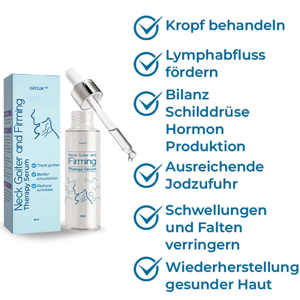 Unser GFOUK™ Nackenkropf-und Straffungstherapie-Serum ist formuliert mit einen optimalen Jodgehalt zur wirksamen Regulierung des Schilddrüsenhormonhaushalts bei Menschen mit Kropf Kombiniert mit den therapeutischen Eigenschaften von Rosskastanienextrakt und Hamamelis, es fördert den Lymphfluss und die Durchblutung. Dieses umfassende Konzept hilft reduzieren Schwellungen am Hals, glätten Falten, und ein verfeinertes Hautbild zu erhalten.