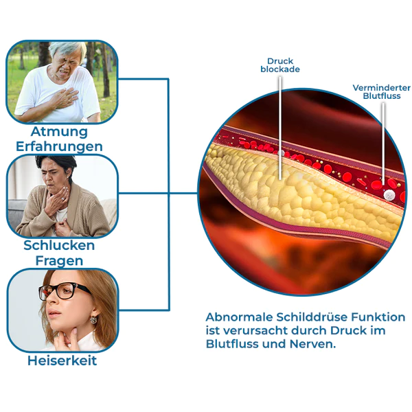 Ein Kropf übt auch Druck auf benachbarte Blutgefäße und Nerven aus, zu Schmerzempfindungen führen, Unbehagen, und Herausforderungen wie Atembeschwerden, Schluckbeschwerden, und Heiserkeit. Zusätzlich, kann es das Risiko an Krebs zu erkranken erhöhen und haben tiefgreifende Auswirkungen auf kritische Aspekte wie den Stoffwechsel, Energielevel und allgemeines körperliches Wohlbefinden.