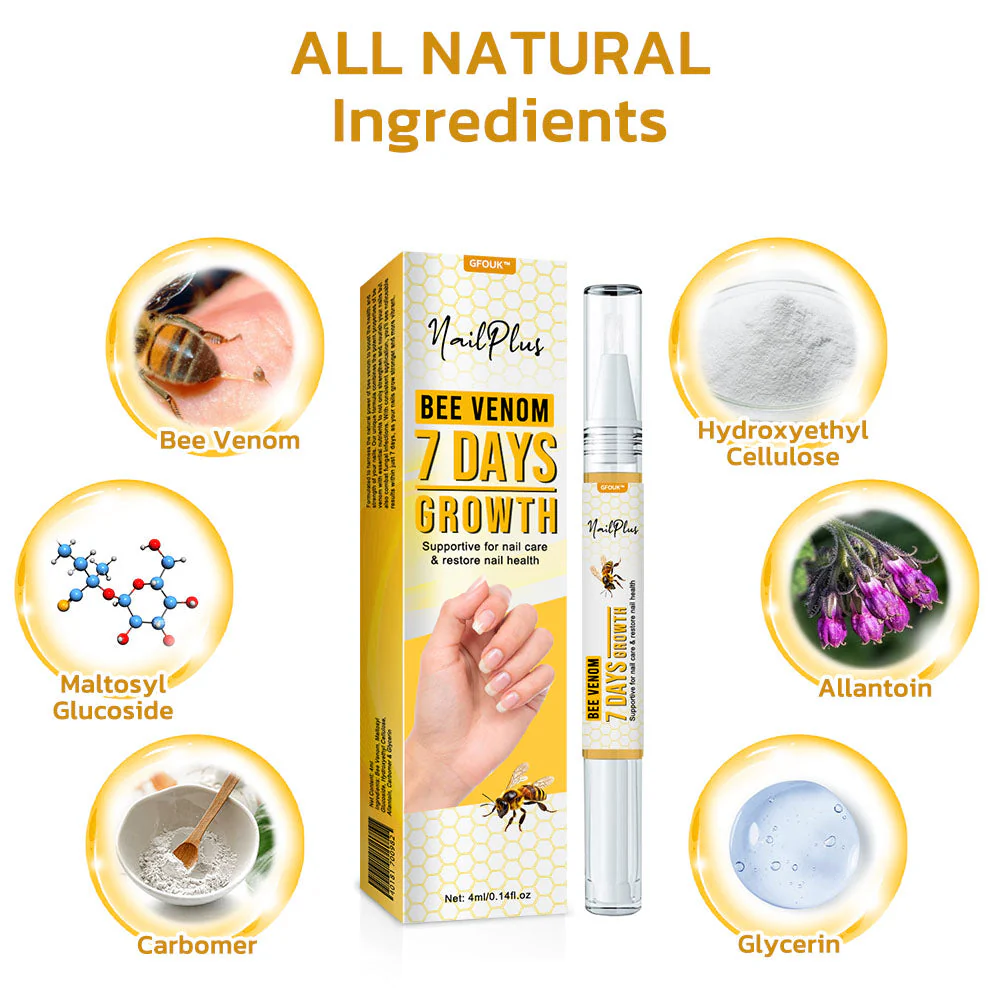 Bee venom is a remarkable natural ingredient known for its regenerative properties. In our GFOUK™ NailPlus Strong Bee Venom 7 Days Growth Nail Gel, bee venom plays a crucial role in promoting robust nail development. It stimulates blood circulation, enhancing the delivery of essential nutrients to the nails. This process triggers the proliferation of new cells, leading to healthier, faster nail growth, Bee venom also helps in the production of collagen, essential for strong and resilient nails.