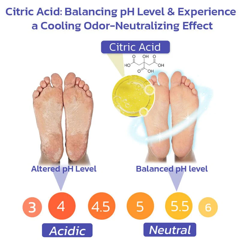 In order to keep the pH levels of the skin in check, Citric Acid is an essential component in the process of preserving the health of your foot. In addition to assisting in the restoration of the skin’s naturally acidic pH, citric acid also helps to create an environment that is less conducive to the growth of harmful microbes and fungus. After a long day, particularly, the cooling impact that citric acid has on weary, achy feet gives rapid relief and relaxation. This is especially true after the acid has been applied.