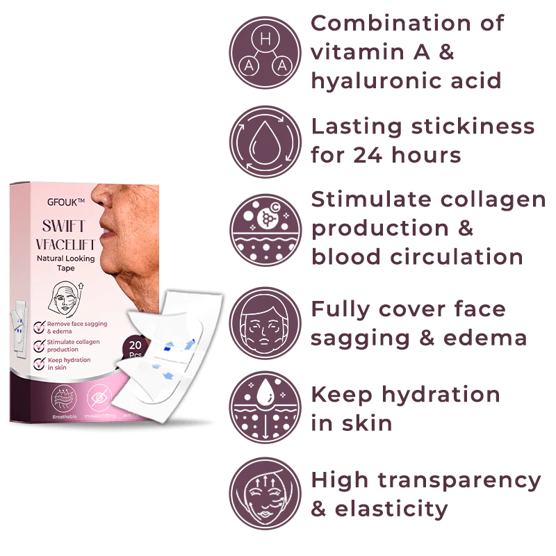 “Extensive testing has conclusively demonstrated that the material used in GFOUK™ Swift VFacelift Natural Looking Tape, exceptional breathability and durability allows for optimal moisture retention while providing UV resistance, effectively safeguarding against premature skin aging caused by harmful UV rays. Furthermore, my findings indicate that when seamlessly combined with vitamin A and hyaluronic acid, this tape maximizes its anti-sagging and anti edema effects, resulting in a nearly 50% reduction in the appearance of sagging lines and edema with consistent, long-term usage.” – Dr. Priscilla JK