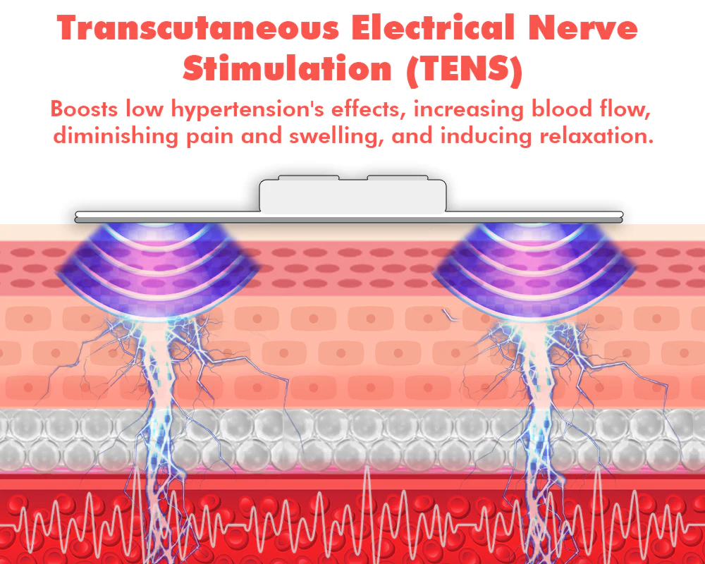 TENS transcutaneously stimulates nerves for therapeutic purposes. It can stimulate acupoints, delivering low-voltage electricity to the nerves. It significantly improves hypertension, increasing blood flow, diminishing pain and swelling, and inducing relaxation.