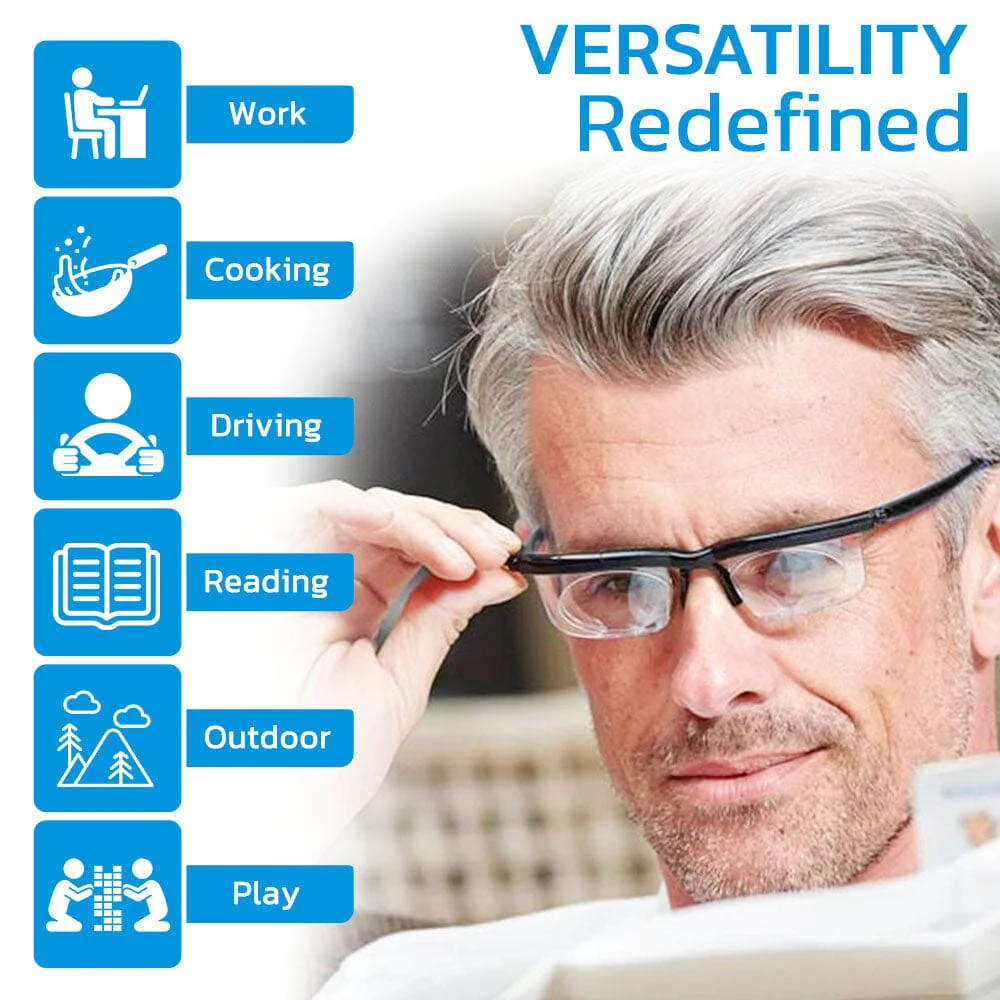 ✔ Adjustable Dual Lens Technology: Effortlessly switch between +, -, and 0 lenses with our adjustable focus glasses, providing instant sharp vision for various distances without the need for multiple pairs.