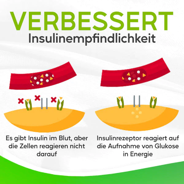 Die Tropfen erhöhen auch die Insulinempfindlichkeit und verringern die Insulinresistenz. Insulin ist das Hormon, das für den Transport von Glukose aus dem Blutkreislauf in die Zellen verantwortlich ist, wo sie zur Energiegewinnung genutzt werden kann. Bei Menschen mit Insulinresistenz reagiert der Körper weniger gut auf die Wirkung von Insulin, was zu hohen Blutzuckerwerten führen kann.GluCare™ Chlorophyll-Zucker-Kontrolltropfen enthalten natürliche Verbindungen, die nachweislich die Insulinempfindlichkeit erhöhen und die Insulinresistenz verringern. Dies hilft dem Körper, Insulin effektiver zu nutzen und fördert eine bessere Blutzuckerkontrolle.