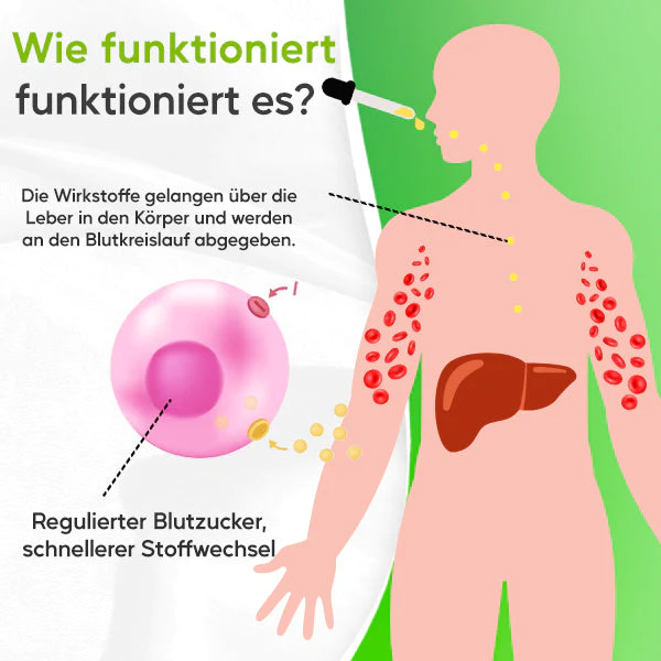 Wenn die Tropfen eingenommen werden, werden die natürlichen Inhaltsstoffe in den Blutkreislauf aufgenommen und zur Leber transportiert, wo sie ihre Wirkung entfalten können. Die Leber spielt eine Schlüsselrolle bei der Regulierung des Blutzuckerspiegels, da sie dafür verantwortlich ist, bei Bedarf Glukose zu produzieren und in den Blutkreislauf abzugeben. GluCare™ Chlorophyll-Zucker-Kontrolltropfen tragen zur Unterstützung eines gesunden Glukosestoffwechsels bei, indem sie die Absorption von Glukose im Darm hemmen und die Aufnahme von Glukose in die Zellen fördern. Dies hilft, Blutzuckerspitzen nach den Mahlzeiten zu vermeiden, und fördert einen stabileren Blutzuckerspiegel über den Tag hinweg.