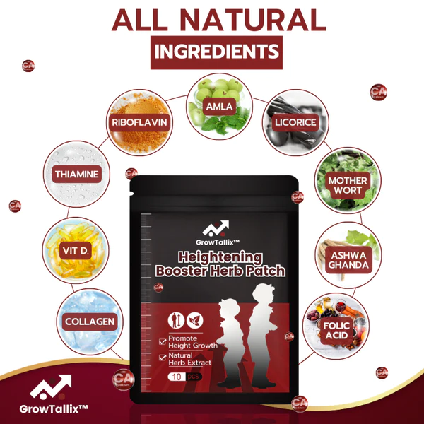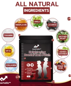 The GrowTallix™️ Heightening Booster Herb Patch contains a diverse mix of vital nutrients, including Collagen, Vitamin D, Thiamine, Riboflavin, Amla, Licorice, Motherwort, Ashwagandha, and Folic Acid. This thoughtfully designed fusion fosters bone health and height enhancement by fortifying bones, facilitating calcium absorption, supporting energy metabolism, and delivering multiple health advantages. With this potent blend, the patches provide an efficacious formula to assist individuals in reaching their height aspirations and promoting overall skeletal well-being.