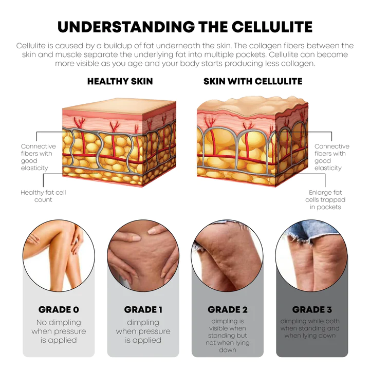 Cellulite occurs when the skin overlying certain areas of fat is pulled downward to the deeper tissues by connective tissue bands. Cellulite can cause the skin to appear bumpy or uneven, especially when the skin is squeezed or pinched. The appearance of cellulite can be shallow or deep, depending on how much of it you have.