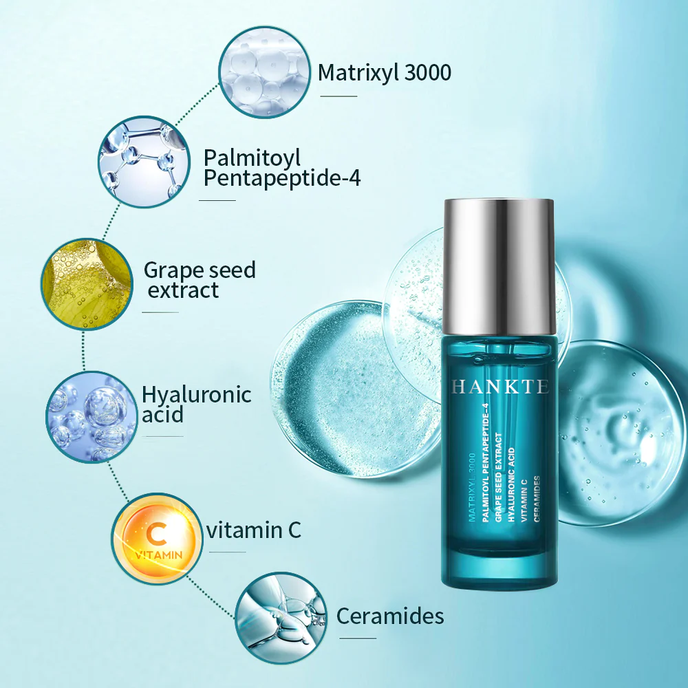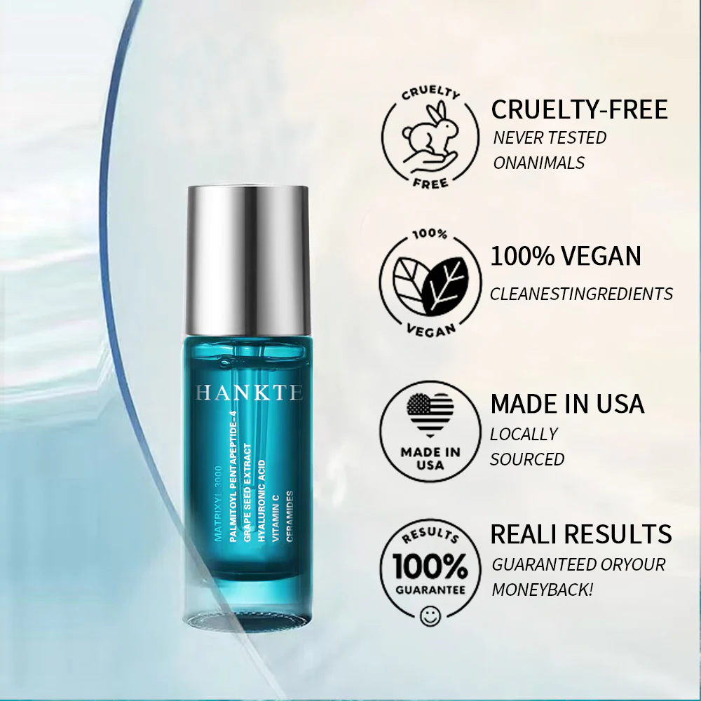 Hankte™ focuses on premium components that work together, and Hankte™ maximizes their effectiveness. Powerful nanoparticle peptides lock in moisture, stimulate collagen production, erase wrinkles, and repair damage, making this the ultimate facial anti-aging serum.
