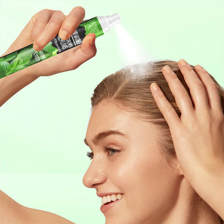 - Spray appropriate and even amounts on the scalp surface and hair roots.