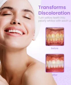 V34 uses color correction technology rather than chemical whitening treatments. Purple is the complementary color of yellow on the color wheel, and applying purple to your teeth helps to counteract the yellow undertones, conceal stains, and enhance shine. This provides an immediate and noticeable improvement in the brightness and whiteness of your teeth without the use of harsh chemicals.