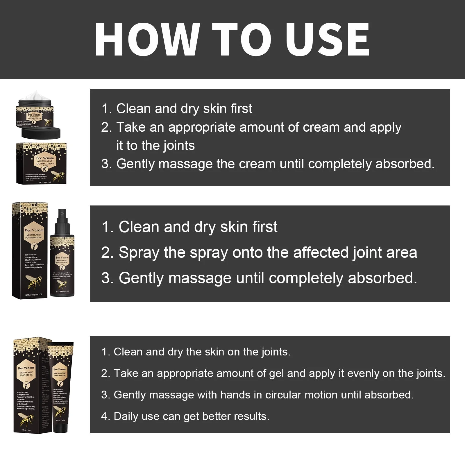 All ingredients are derived from natural plants and bee venom, cruelty free.