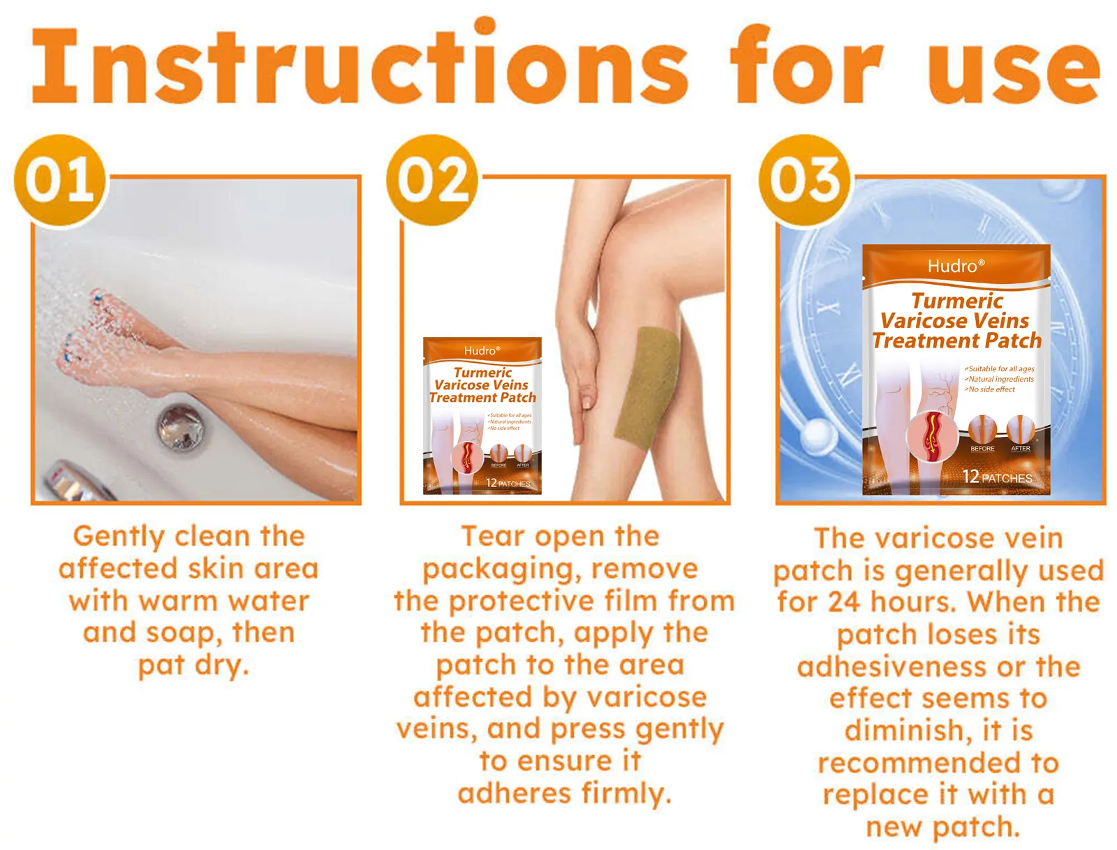 Dive into the evidence of Hudros™‘s effectiveness through a comprehensive clinical study. With 100 participants applying Hudros™ Turmeric Varicose Vein Patch or a placebo twice daily for 12 weeks, the results were nothing short of astounding. Witness the remarkable outcomes in the treatment group: an 98% reduction in the visibility of varicose veins, a 90% improvement in skin texture, a 91% brightening of skin tone, and an 89% increase in skin moisture compared to the control group. These groundbreaking findings solidify Hudros™ as a proven solution for enhancing varicose veins and boosting overall skin health.