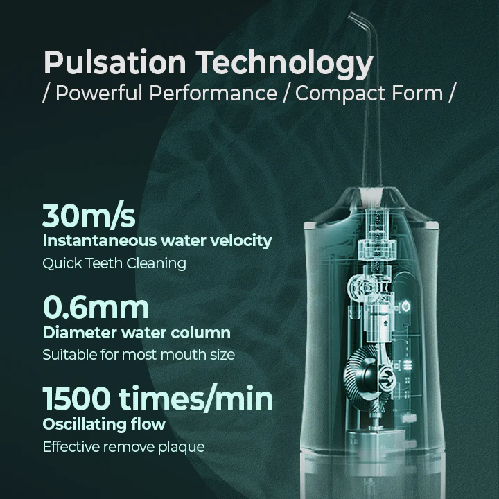 Our HYDRO-Pulse™ Electric Oral Water Flosser comes with a built-in rechargeable battery and copper motor-driven pump that generates the powerful pulsating water flow. Additionally, the device is portable and lightweight, so it doesn’t require too much counter space and is easy to bring anywhere and during travel. Although it’s small, this compact oral water flosser packs a punch in terms of power output and water pressure, ensuring an efficient job of getting gunk out from in between your teeth with each use.
