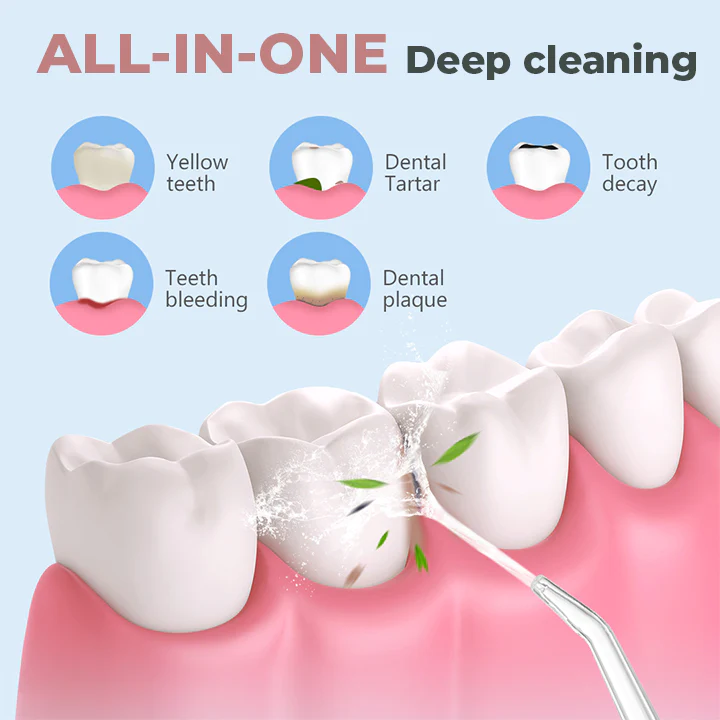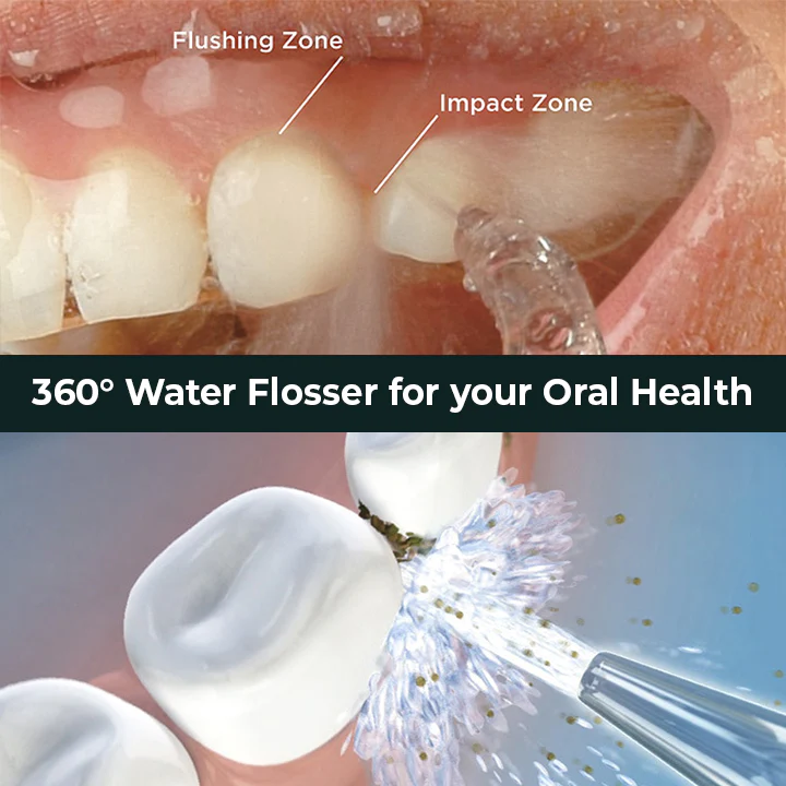 It also features a 360° rotatable nozzle with 4 changeable heads to direct the water jet precisely, ensuring a thorough and comfortable cleaning process. The 360° coverage with different nozzle attachments lets you easily floss at any angle and efficiently remove dirt, plaque, and trapped food particles from hard to reach areas of the mouth and teeth without causing bleeding gums.