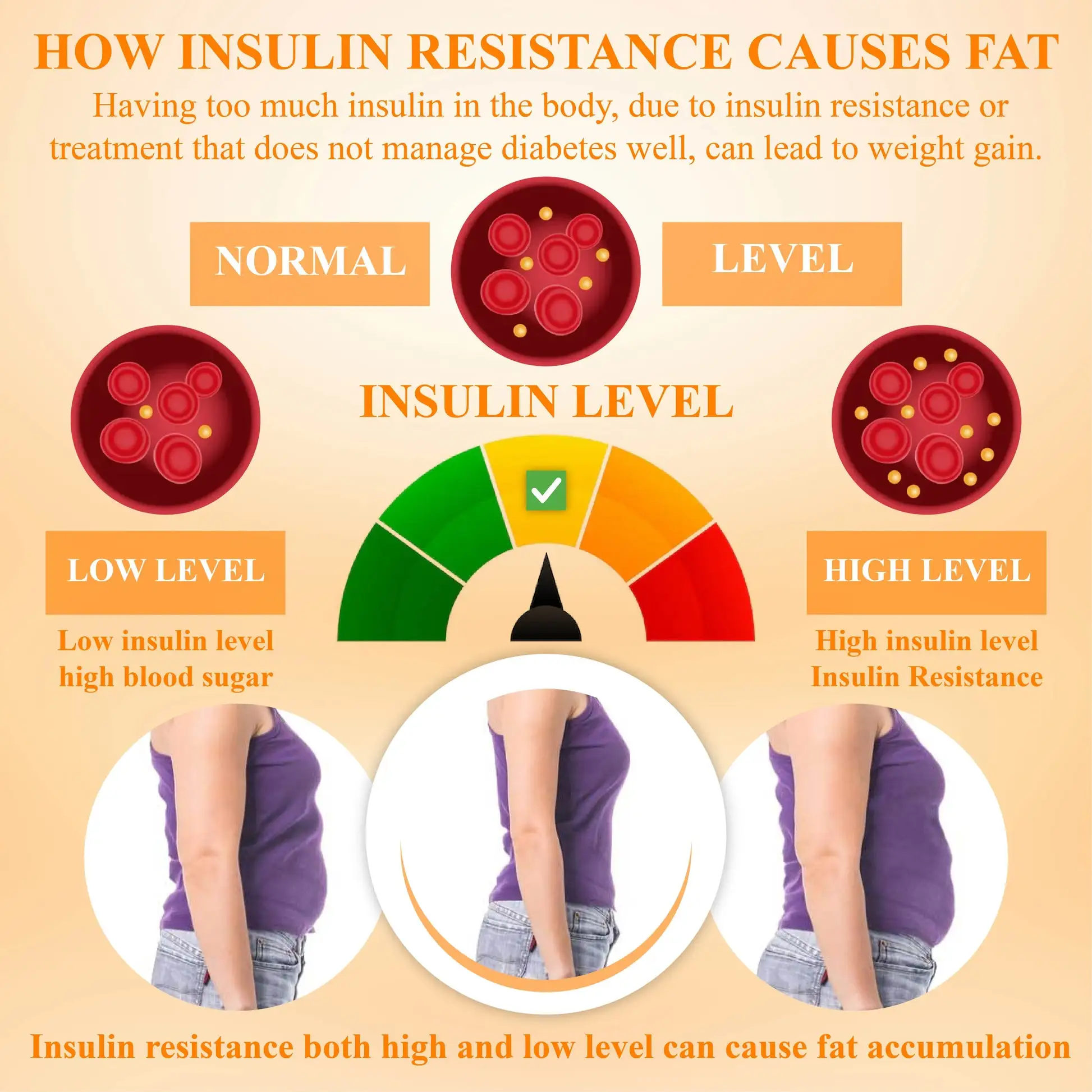 Insulin is crucial for glucose regulation and body composition. Low insulin levels lead to poor glucose absorption, resulting in high blood sugar and increased lipid conversion, which promotes weight gain. Conversely, high insulin levels can cause resistance, prompting the pancreas to produce more insulin and store glucose as lipids, complicating weight loss. InsuBurn™ LipidFlush BodySlimming Cream can help manage insulin levels, improve insulin sensitivity, and support weight management by promoting efficient glucose utilization and reducing lipid storage, aiding in achieving a healthier body composition.