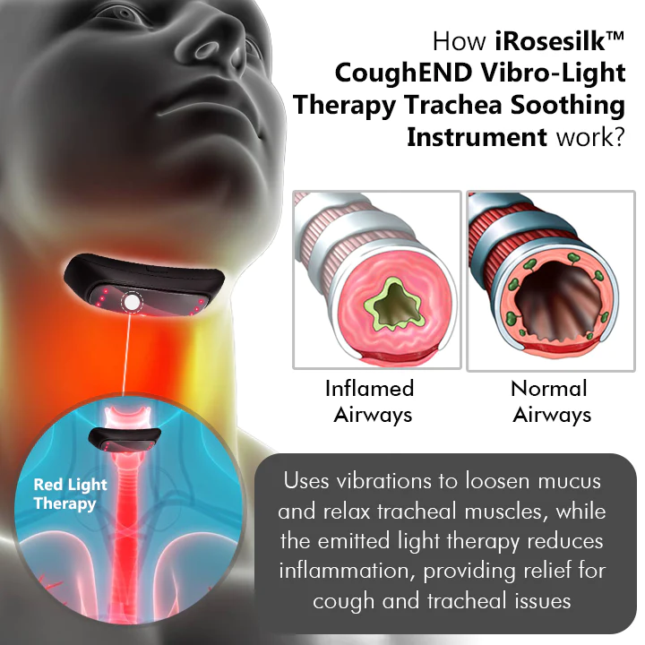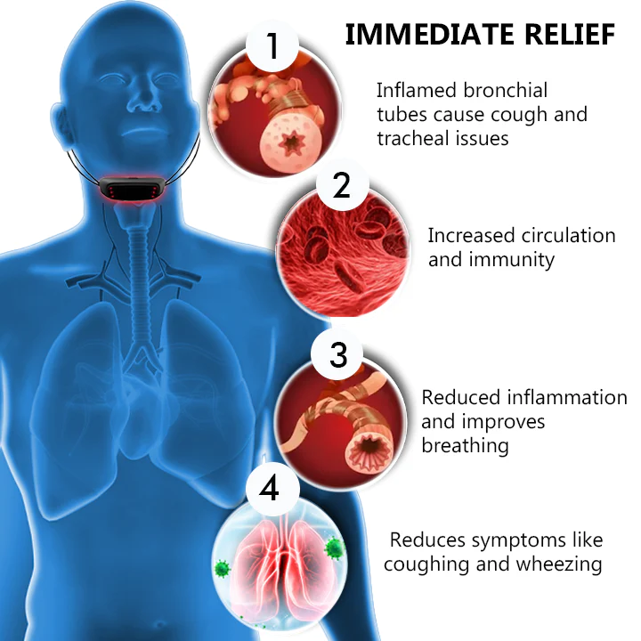 This device targets the root causes of coughing and tracheal discomfort to improve breathing. It soothes the trachea and supports healing, indirectly enhancing breathing. It reduces inflammation, eases pain, and aids tissue repair, creating a more comfortable tracheal environment. As the trachea heals and irritation lessens, airflow becomes smoother, improving breathing.