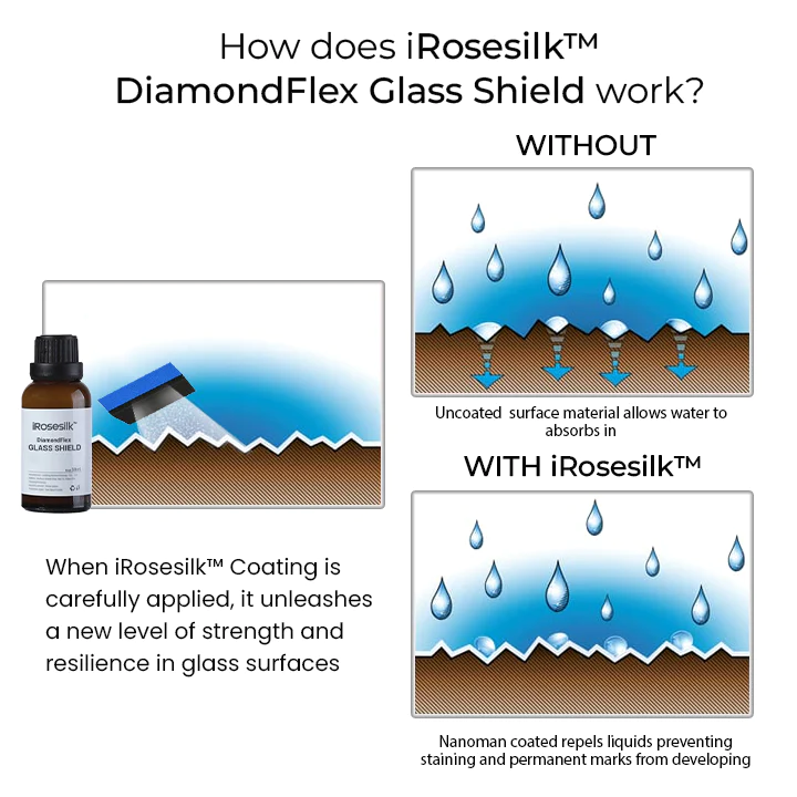 Utilizando nanotecnología de última generación, iRosesilk™ DiamondFlex Glass Shield es un revestimiento protector profesional utilizado por diversas industrias. Forma un escudo invisible que refuerza el vidrio y aumenta significativamente su durabilidad contra el desgaste diario y mantiene un acabado brillante similar al del diamante.