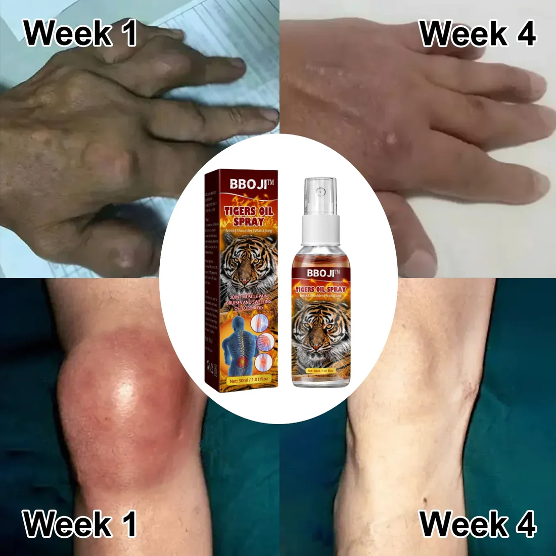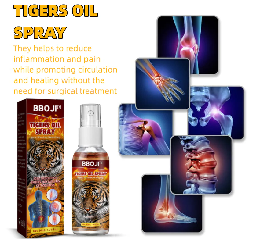 - BBOJI™ Tigers Oil Spray combines the essence of natural herbs such as peppermint, clove and camphor, ancient herbs that have been used for centuries to treat arthritis. Their miraculous effects have been passed on and modern science has determined that these ingredients are analgesic, improve blood circulation, reduce arthritis and help repair damaged joint tissues.