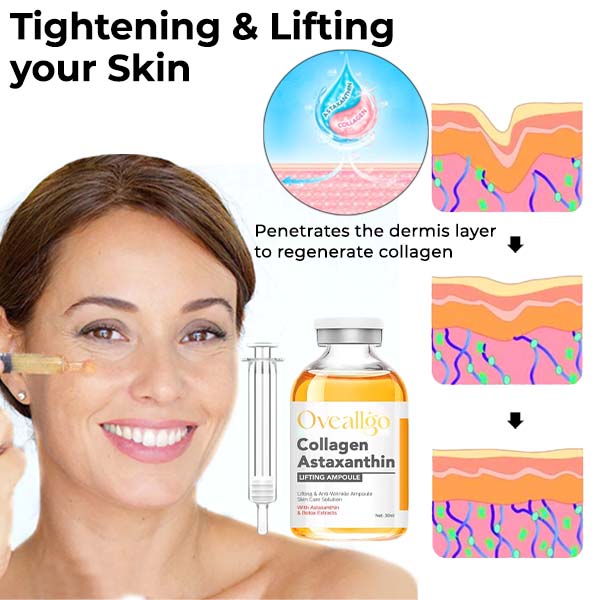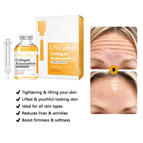 Oveallgo™ FirmTox Collagen Astaxanthin Lifting Ampoule works by providing the skin with powerful anti-aging ingredients that target the underlying causes of wrinkles and other signs of aging. The high-quality ingredients in our formula work together to stimulate collagen production, which is essential for maintaining the skin’s elasticity and firmness. This helps to plump up the skin and reduce the appearance of fine lines and wrinkles, giving you a more youthful and radiant complexion.