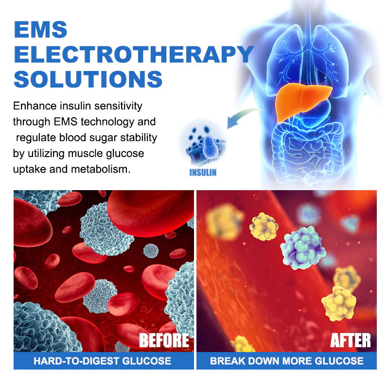 Commonly employed for managing blood sugar levels and enhancing glucose control are various medications, such as Oral Antidiabetic Drugs and Injectable Medications like insulin. Nevertheless, the KISSHI™ GlycoWave Blood Sugar Control Device presents a fresh perspective on sugar level balance through EMS technology. By boosting insulin sensitivity and utilizing the muscles’ ability for glucose uptake and metabolism, this device establishes a new paradigm in blood sugar management.