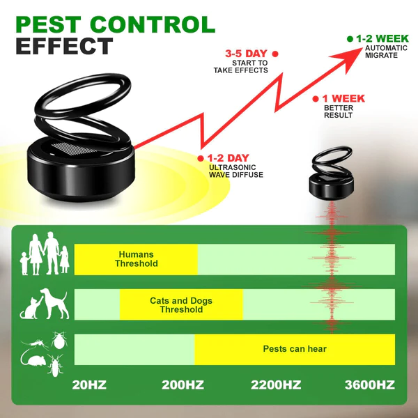Ultrasonic Sound Waves: Our Pest Repel Device emits powerful ultrasonic sound waves that are imperceptible to humans and pets but intolerable to common pests like rodents, insects, and spiders. This non-invasive and environmentally friendly approach effectively deters pests without causing harm.