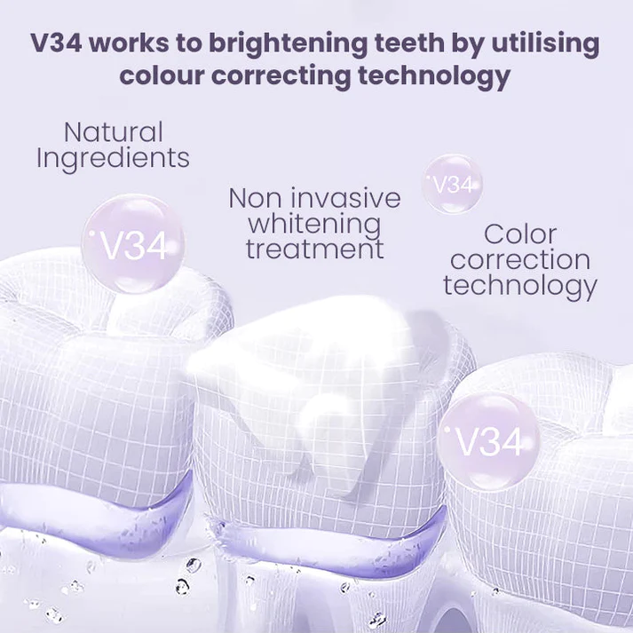 v34: It uses color correction techniques, not chemical whitening treatments. Purple is the exact opposite of the yellow color on the color wheel and is therefore a complementary color.Applying purple to your teeth counteracts the yellow undertones, hides stains and improves shine, giving you an instant, noticeably brighter white color.