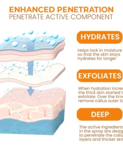 Simply spray it on, let it work its magic, and watch as your calluses vanish, leaving you with baby-soft, touchable feet. The spray’s active exfoliating ingredients penetrate the thickened, dry callus skin. They work on a cellular level, dissolving or loosening the intercellular glue that holds the dead skin cells together. It promotes increased cell turnover, encouraging the shedding of dead skin cells. This process helps to slough off the thickened, dry callus skin layers gradually.