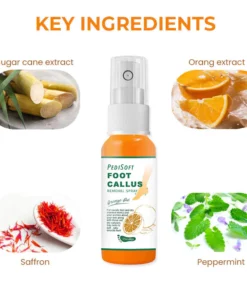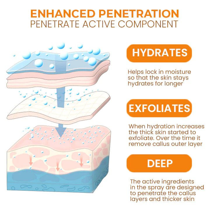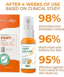 Oveallgo™ PediSoft Foot Callus Removal Spray typically works by softening and breaking down the callus’ thicker, harder skin. The spray formulation allows for simple and targeted application. The spray’s active ingredients are designed to penetrate the thickened skin and reach the callus layers.