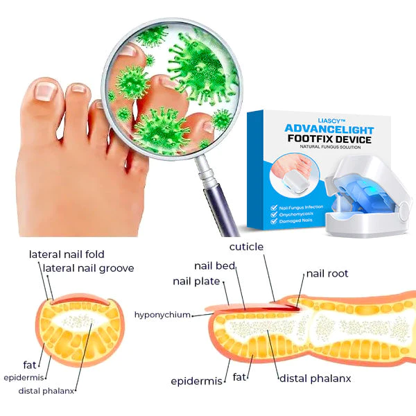 The Liacsy™ AdvanceLight FootFix Device is a powerful combination of blue light therapy and infrared cold laser technology that dramatically reduces the presence of fungi, decreases inflammation, and stops infections from occurring. This device is clinically proven to provide relief for foot pain and swelling, gets rid of pus or pustules, and stops itching, peeling, and thickening of nails.