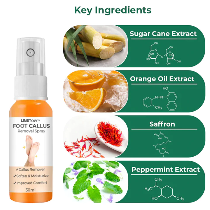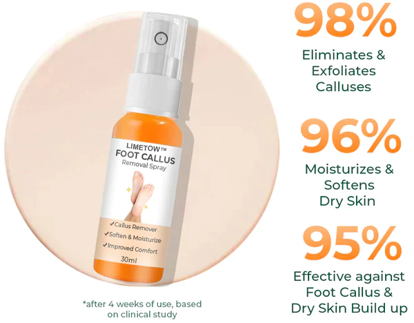 LIMETOW™ Foot Callus Removal Spray normally works by softening and breaking down the thicker, hardened skin of calluses. The spray composition enables simple and focused application. The active components in the spray are intended to penetrate the thickened skin and reach the callus layers.