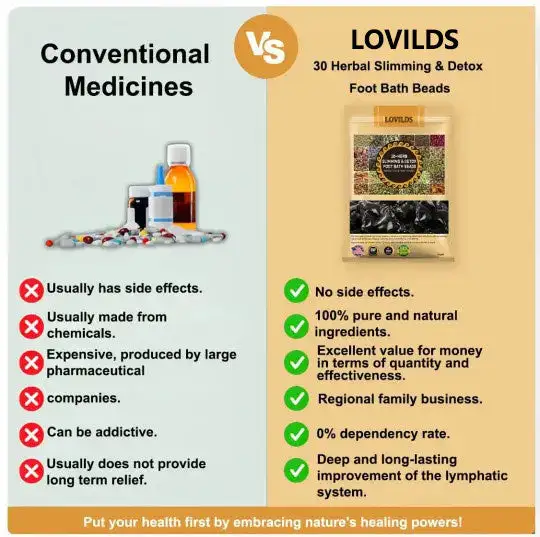 LOVILDS™ is lymphologist-tested, entirely hypoallergenic, and suitable for all ages. LOVILDS™ 30 Herbal Foot Bath Beads for Weight Loss and Detoxification are 100% natural, serving as an alternative to various prescription, over-the-counter, and weight loss medications. Over time, they help to gradually enhance the functioning of the lymphatic system and naturally boost the immune system.
