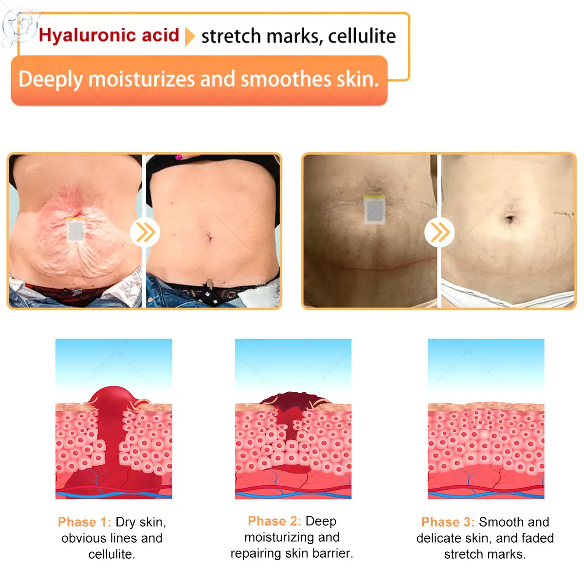 Hyaluronic acid deeply hydrates the skin. helping reduce the appearance of stretch marks and smoothing the skin’s surface. It also strengthens the skin barrier. giving a healthy. radiant glow.