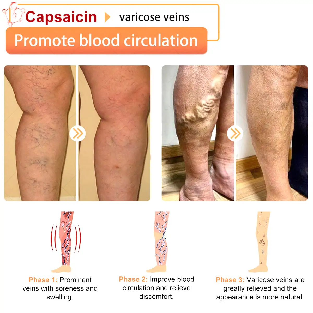 Capsaicin stimulates blood flow. easing the discomfort caused by varicose veins. It improves blood vessel elasticity. relieving pressure around the veins to effectively alleviate varicose vein symptoms.