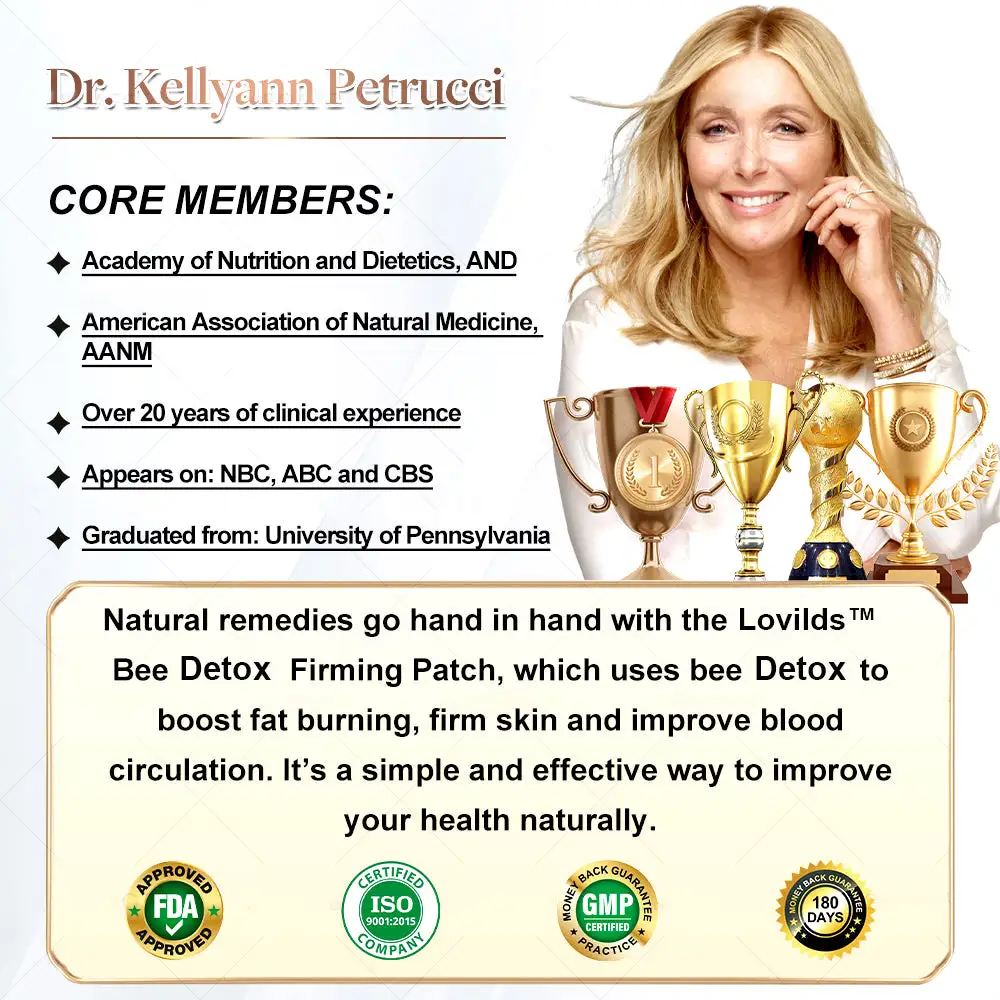 “As an endocrinologist. I have always been passionate about finding natural and effective solutions to help people lose weight. After extensive research and testing with my lab team. combined with clinical trials involving over 2.000 participants. I discovered that Bee Detox is a powerful natural ingredient that promotes fat breakdown and boosts metabolism. This discovery led me to create the LOVILDS™ Bee Detox Firming Slimming Patch—a comprehensive solution designed to naturally and effectively aid in fat loss and body shaping.”-Dr. Kellyann Petrucci