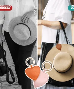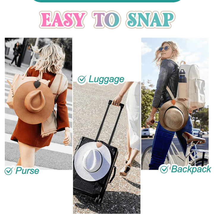 Easy to Use This easy travel hat clip can be effortlessly attached to any bag in no time with just 2 steps. Simply fasten the gold carabiner to the strap or handle of your bag, then snap the magnet around the brim of your hat, and you’re good to go! You can also just open the magnetic snap anytime to take off your hat or if you want to put it back.