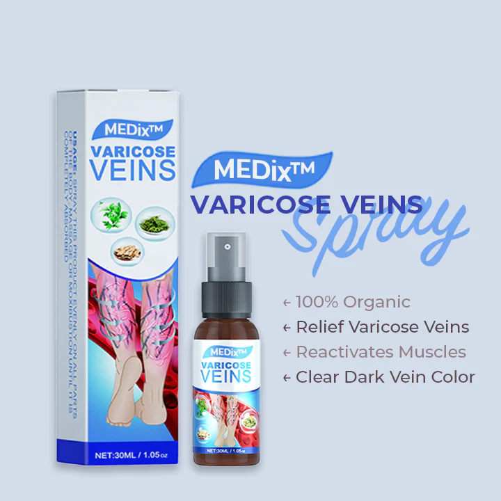 MEDix™ Vein Care Lightening Spray MEDix™ Vein Care Lightening Spray is intended as a non-invasive alternative therapy to relieve varying degrees of vein problems and their complications. It contains 5 kinds of natural Chinese medicine ingredients, through the use of spray can penetrate the skin through its comprehensive effect, enter blood vessels, stimulate blood vessel contraction and dilation, accelerate blood circulation, reduce fluid retention, thereby relieving varicose veins as well as lymphedema, reducing loose body fat, Purifies the body.