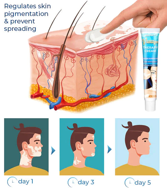 Topical treatment known as MelFix™ Vitiligo Therapy Cream are created particularly to address the loss of pigmentation in vitiligo-affected skin. The cream employs a number of processes to encourage repigmentation and stop the spread of vitiligo.