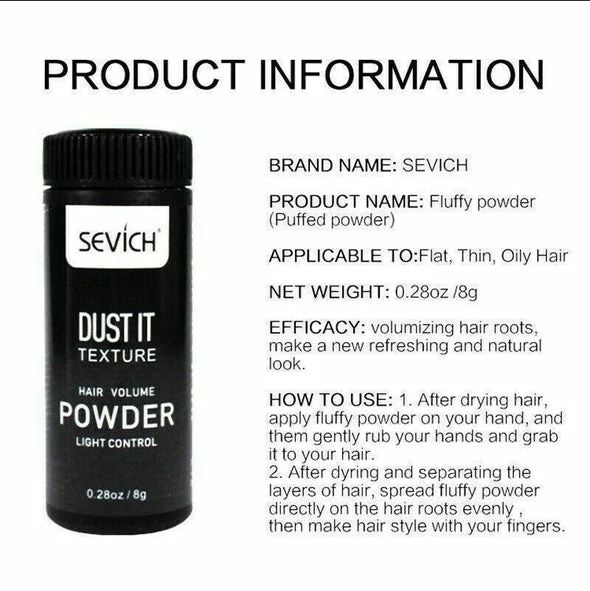 S.V. Dust it transforms dull, greasy hair into thick-looking, volumized hair that is full of life. It is also makes naturally thick hair easier to control and form the exact style you lust after. You can do it in seconds with the S.V. Dust it powder. You will look top notch for every meeting, party & event you attend.