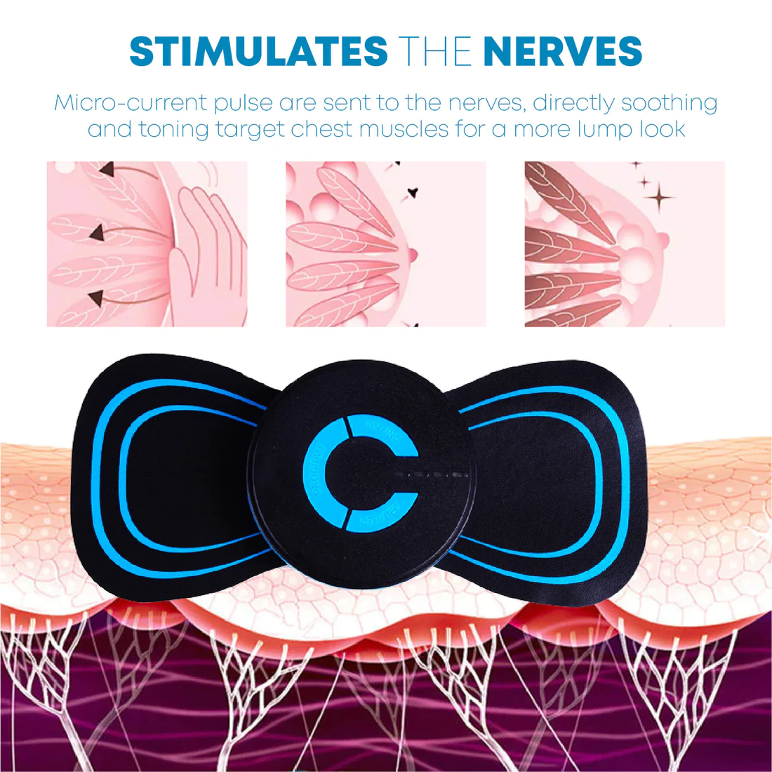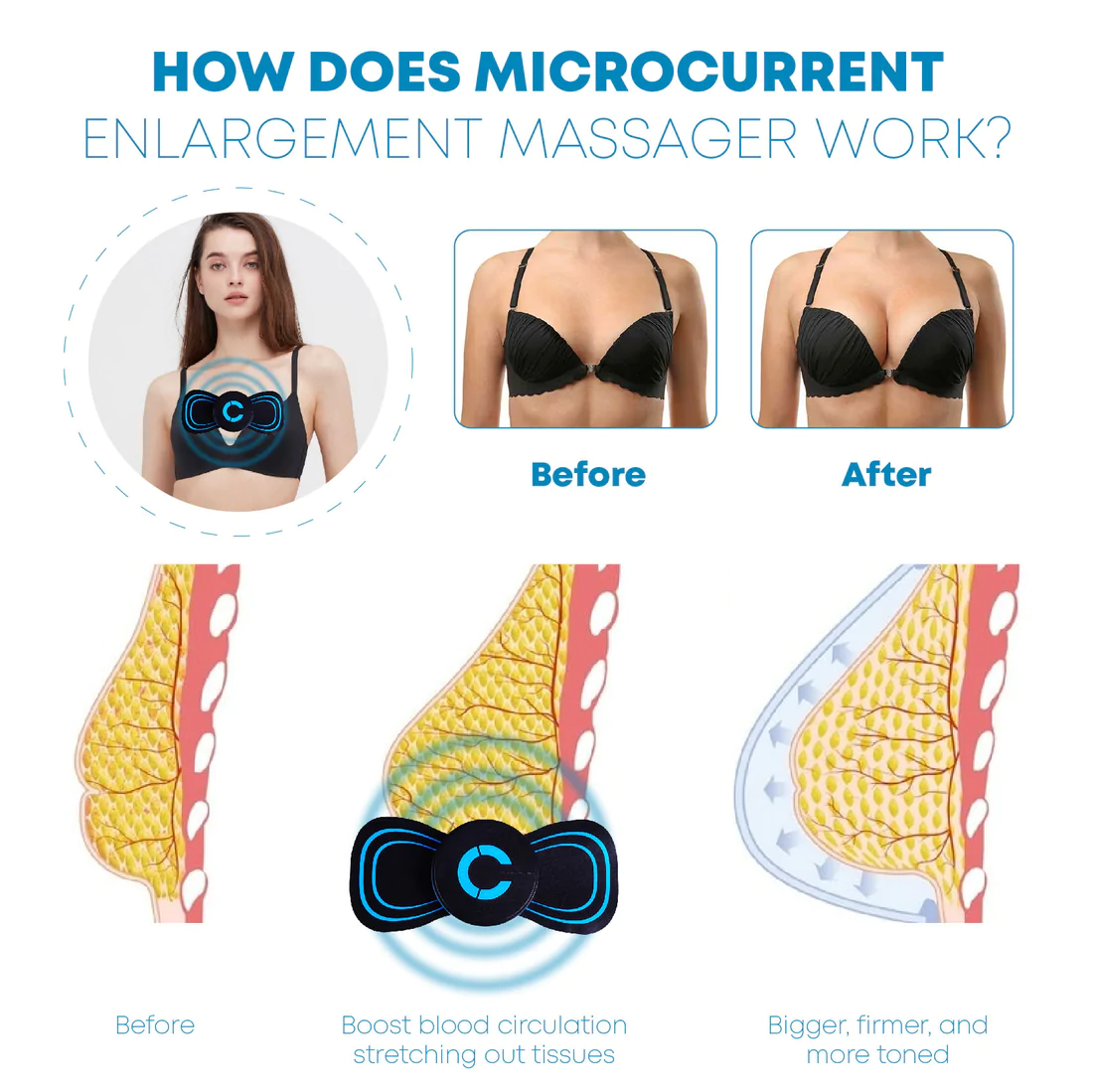 Microcurrent devices work by delivering an electrical current to muscles and skin cells. The idea behind this is that the electrical current can enhance breast size or increase breast growth, lifting and tightening the skin. Some companies also claim that microcurrent facials stimulate collagen production. Microcurrent is a way to stimulate the muscles with a small electrical current.