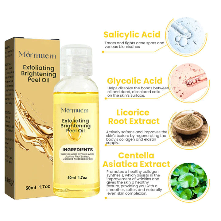 Overall, the combination of these four natural ingredients in the Exfoliating Brightening Peel Oil works synergistically to remove dead skin cells, exfoliate the skin, and brighten the complexion. They also help to soothe and calm inflamed, irritated skin while promoting cellular renewal and protecting against environmental stressors.