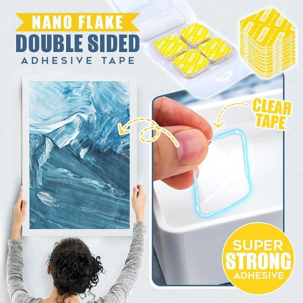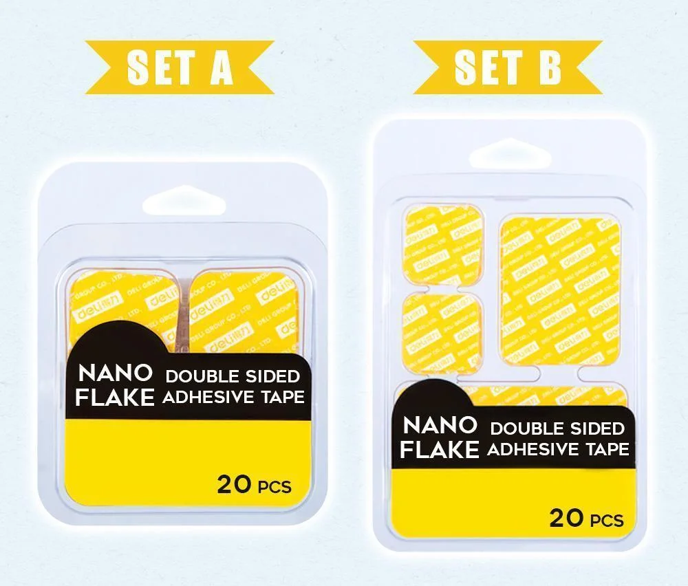 Our improved Nano Flake Double Sided Adhesive Tape is very strong, durable, removable, no trace and no residue. It can be stretched, folded, cut to any size and length.