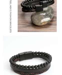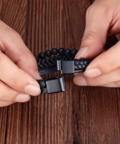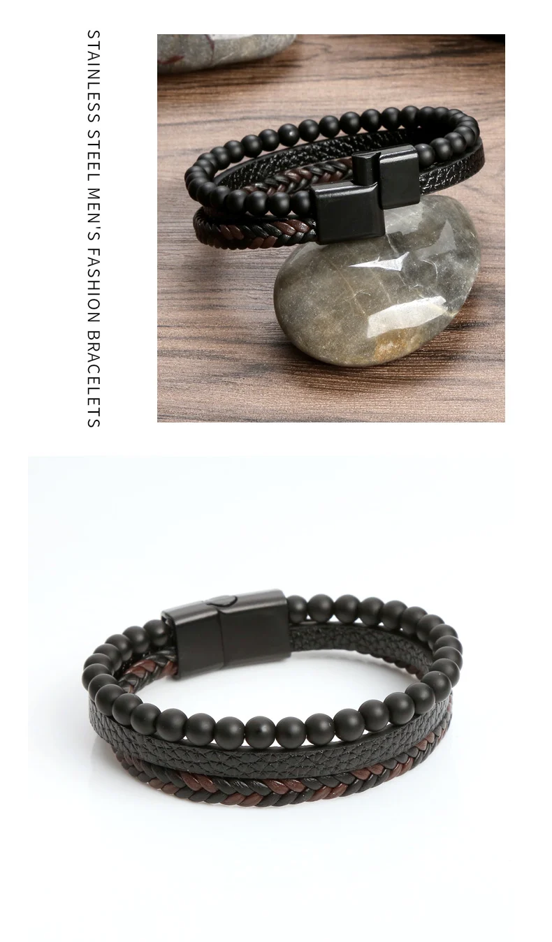 Natural Stone Obsidian Magnetic Buckle Men’s Leather Bracelet
